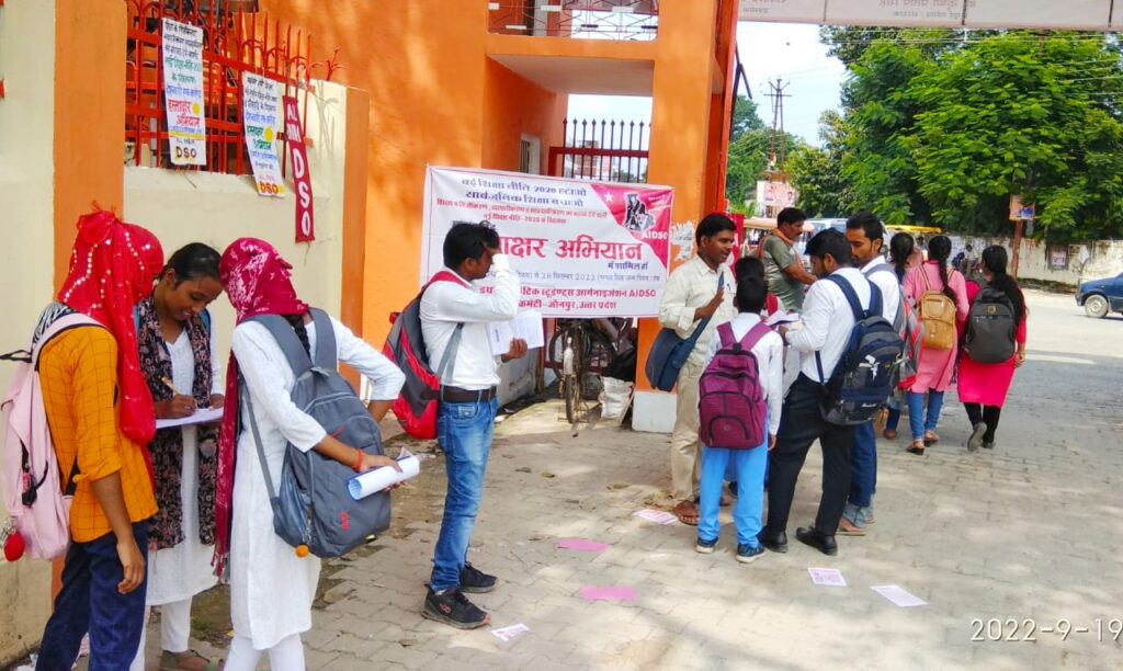 ऑल इण्डिया डेमोक्रेटिक स्टूडेंट्स आर्गेनाइजेशन (एआईडीएसओ) की अखिल भारतीय कमेटी के आह्वान पर शिक्षा के निजीकरण, व्यापारीकरण व सांप्रदायीकरण को बढ़ावा देने वाली नई राष्ट्रीय शिक्षा नीति 2020 के खिलाफ एक करोड़ देशव्यापी हस्ताक्षर अभियान चलाया जा रहा है। जिसका समापन 28 सितम्बर 2022 को शहीद ए आज़म भगत सिंह जयंती के अवसर पर देश के विभिन्न राज्यों में राज्य मुख्यालयों पर छात्र प्रदर्शन आयोजित कर प्रधानमंत्री को संबोधित ज्ञापन हस्ताक्षर पत्र राज्यपाल को सौंप कर किया जाएगा। इसी कड़ी में एआईडीएसओ की उत्तर प्रदेश राज्य कमेटी के द्वारा 28 सितंबर 2022 को लखनऊ इको गार्डन में राज्य स्तरीय छात्र प्रदर्शन आयोजित कर हस्ताक्षर पत्र महामहिम राज्यपाल उत्तर प्रदेश को सौंपने का निर्णय लिया गया है।