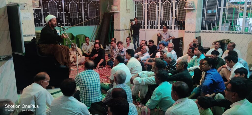 चहारसू की रौजे वाली मस्जिद में मरहूम हसीन अहमद की सालाना मजलिस शेख नुरुल हसन मेमोरियल सोसायटी के द्वारा आयोजित की गई मजलिस को आली जनाब मौलाना उरूज हैदर खान साहब ने संबोधित करते हुए कहा कि इस्लाम का पहला फलसफा खिदमते हल्क है मौलाना ने कहा कि इस्लाम मजहब को मानने वाला कभी आतंकवादी नहीं हो सकता वह कभी भी आतंकवाद की पैरवी नहीं कर सकता अगर वह इस तरह की हरकत करता है तो यह मानना चाहिए कि वह केवल नाम का मुसलमान है,, अच्छा और सच्चा मुसलमान वही जो किसी को तकलीफ न पहुंचाएं ,हजरत इमाम हुसैन की शहादत को सुनकर उपस्थित जन दहाड़े मार कर रोने लगा। मजलिस में शोज़ खानी जनाब नजफ साहब और उनके साथियों ने की पेशखानी जनाब सैफ अब्बास एवं जनाब सुर्खाब ने की जनाब नईम हैदर के नेतृत्व मेंअंजुमन कासिमियाने नौहा, मातम किय मजलिस के आखिर में मरहूम हसीन अहमद इब्ने शेख नूरुल हसन मरहूम के लिए सूरह फातिहा पढ़ी एवं समाजसेवी अली मंजर डेज़ी ने मजलिस में आए हुए सभी का शुक्रिया अदा किया इस मौके पर मुख्य रूप से अजहर अब्बास, वसीम हैदर, असलम नकवी ,तहसीन अब्बासी, सोनी,फ़ैज़ , डॉक्टर राहिल, सिकंदर इकबाल, नियाज हैदर, फिरोज हैदर नासिर रजा गुड्डू, मुन्ना, मोहम्मद, बहादुर ,सोनू ,राजा, तालिब रजा शकील, अहसन नजमी, एडवोकेट शकील अहमद, मिर्जा बाबर, समाजसेवी सैयद परवेज हसन जाफर अब्बास, वसीम अहमद, मुनीर सीकणवाला,शहरयार, शौकत मास्टर, ,इसरार हुसैन एडवोकेट, इजहार हुसैन खां, इस्सन, आसिफ आब्दी, इत्यादि लोग मौजूद रहे