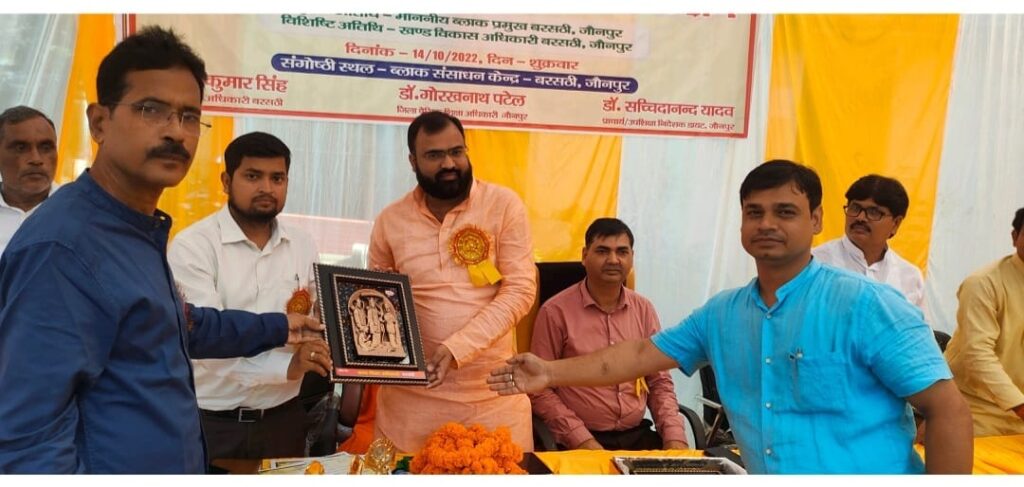 आज विकास क्षेत्र बरसठी के बी आर सी प्रांगण में एक दिवसीय ग्राम प्रधान/स्थानीय प्राधिकारी के उन्मुखीकरण से सम्बंधित कार्यक्रम का आयोजन किया गया जिसमें सरकार द्वारा संचालित विभिन्न कार्यक्रमों यथा DBT के माध्यम से बच्चों के गणवेश जूता मोजा बैग स्वेटर तथा स्टेशनरी क्रय हेतु सीधे अभिभावकों के खातों में ₹ 1200 का हस्तांतर दीक्षा एप रीड एलांग एप्प व निपुण भारत अभियान के तहत बच्चों को आधारभूत व बुनियादी शिक्षा में निपुण बनाने की संकल्पना साथ ही कायाकल्प आदि के तहत हर ग्रामसभा में 19 पैरामीटर की अवस्थापना के संबंध में बोलते हुए ब्लॉक प्रमुख बरसठी ने कहा कि ब्लॉक के समस्त प्राथमिक विद्यालय में कायाकल्प से सम्बंधित अधूरे कार्य को पूर्ण कराना मेरे मुख्य एजेंडे में शामिल है उन्होंने परिषदीय विद्यालयों में शिक्षण व्यवस्था बाकी भूरी भूरी प्रशंशा किया ।विशिष्ट अतिथि के उपस्थित खंड विकास अधिकारी प्रवीण कुमार तिवारी ने कहा कि ग्राम विकास अधिकारी द्वारा भौतिक सत्यापन कराकर परिषदीय विद्यालयों को 19 मूलभूत व्यवस्था से आच्छादित कराना मेरी सर्वोच्च प्राथमिकता में है कार्यक्रम का संचालन जिला संगठन मंत्री अश्वनी कुमार सिंह ने किया ।