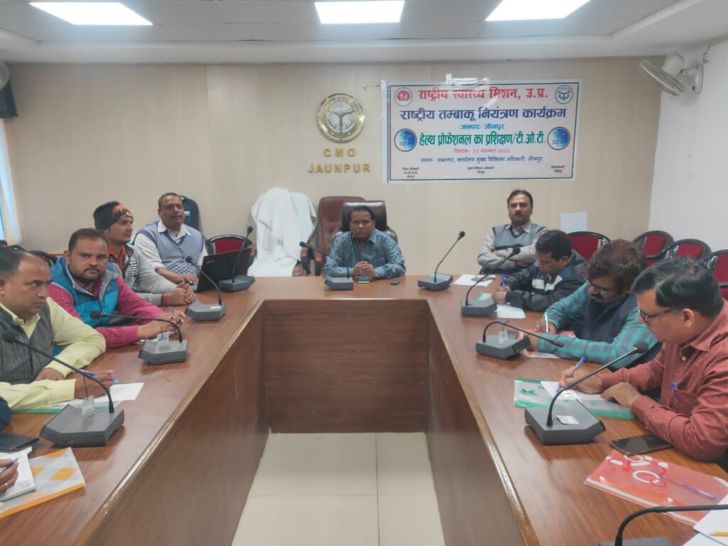 जौनपुर, 25 नवम्बर 2022। मुख्य चिकित्साधिकारी कार्यालय सभागार में शुक्रवार को स्वास्थ्यकर्मियों का राष्ट्रीय तम्बाकू नियंत्रण कार्यक्रम के तहत प्रशिक्षण हुआ। उत्तर प्रदेश वालंटरी हेल्थ एसोसिएशन लखनऊ से आए दिलीप कुमार ने कोटपा अधिनियम के बारे में जानकारी दी।