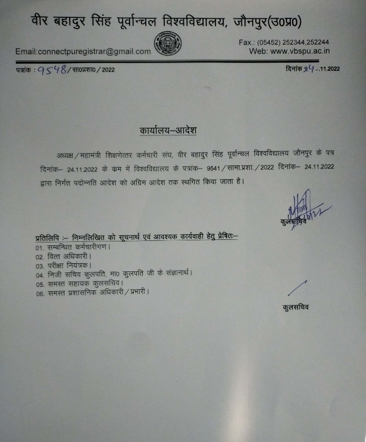 जौनपुर। वीर बहादुर सिंह पूर्वांचल विश्वविद्यालय में 20 कर्मचारियों के पदोन्नति का मामले मे कर्मचारी संघ आपत्ति के चलते कुलसचिव को पदोन्नत प्रक्रिया स्थगित करनी पड़ी। शपथ ग्रहण के पहले ही संघ के मांग पत्र पर यह कार्रवाई हुई है ।जिसे लेकर कर्मचारियों में हलचल बढ़ गई है ।
