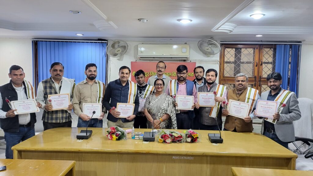 जौनपुर. वीर बहादुर सिंह पूर्वांचल विश्वविद्यालय के कुलपति सभागार में शुक्रवार को शोध परियोजना प्राप्त करने वाले शिक्षकों को कुलपति प्रो. निर्मला एस मौर्य ने सम्मानित किया.